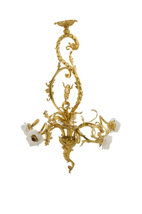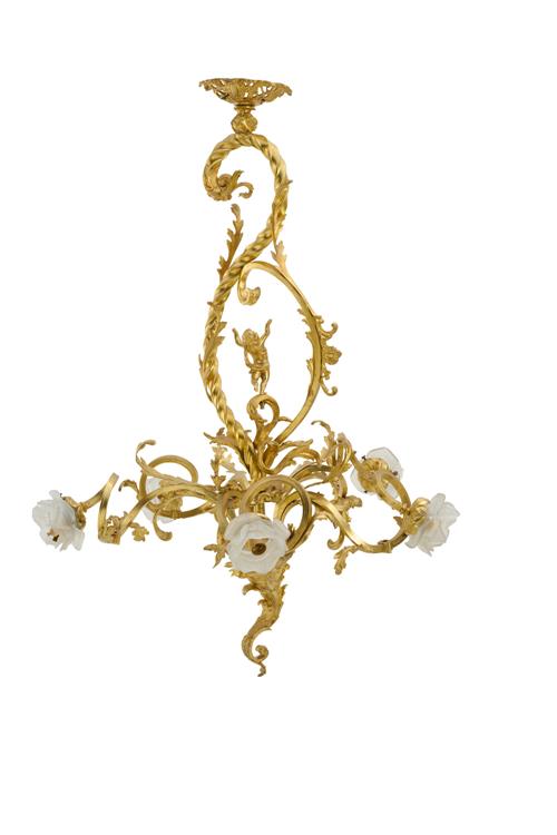 Of five lights with moulded glass rose shades on scrolling arms beneath a scrolling stem with a figure of a putto