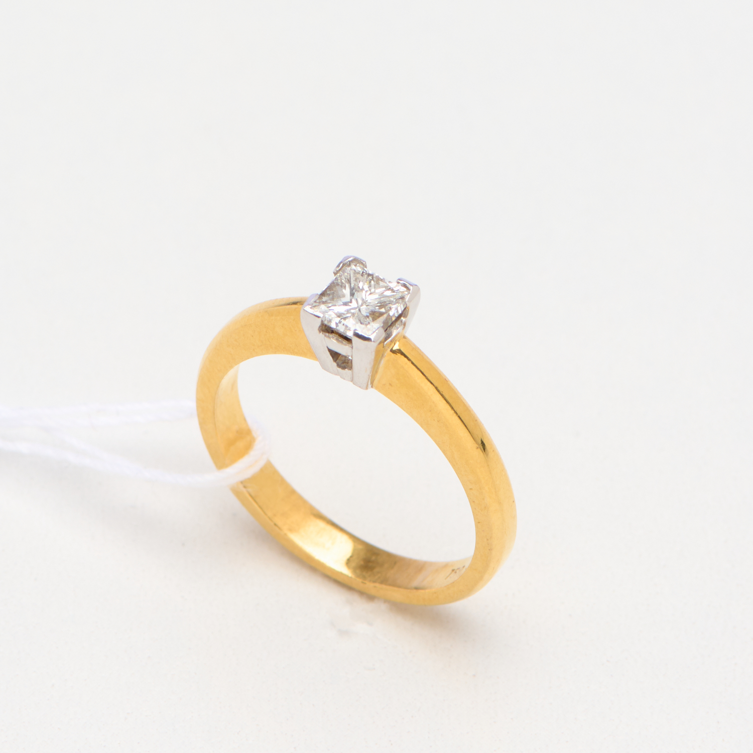 A SOLITAIRE PRINCESS CUT DIAMOND RING IN 18CT TWO TONE GOLD, RING SIZE O, THE DIAMOND TOTALLING 0.60CTS, G/VS, 4.70GMS