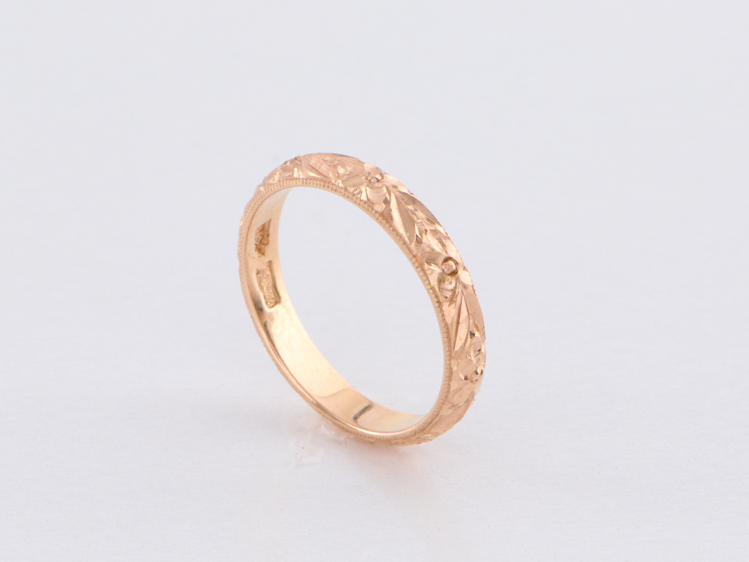 AN ENGRAVED BAND RING IN 14CT ROSE GOLD, RUSSIAN HALLMARKS, RING SIZE M, 2.70GMS