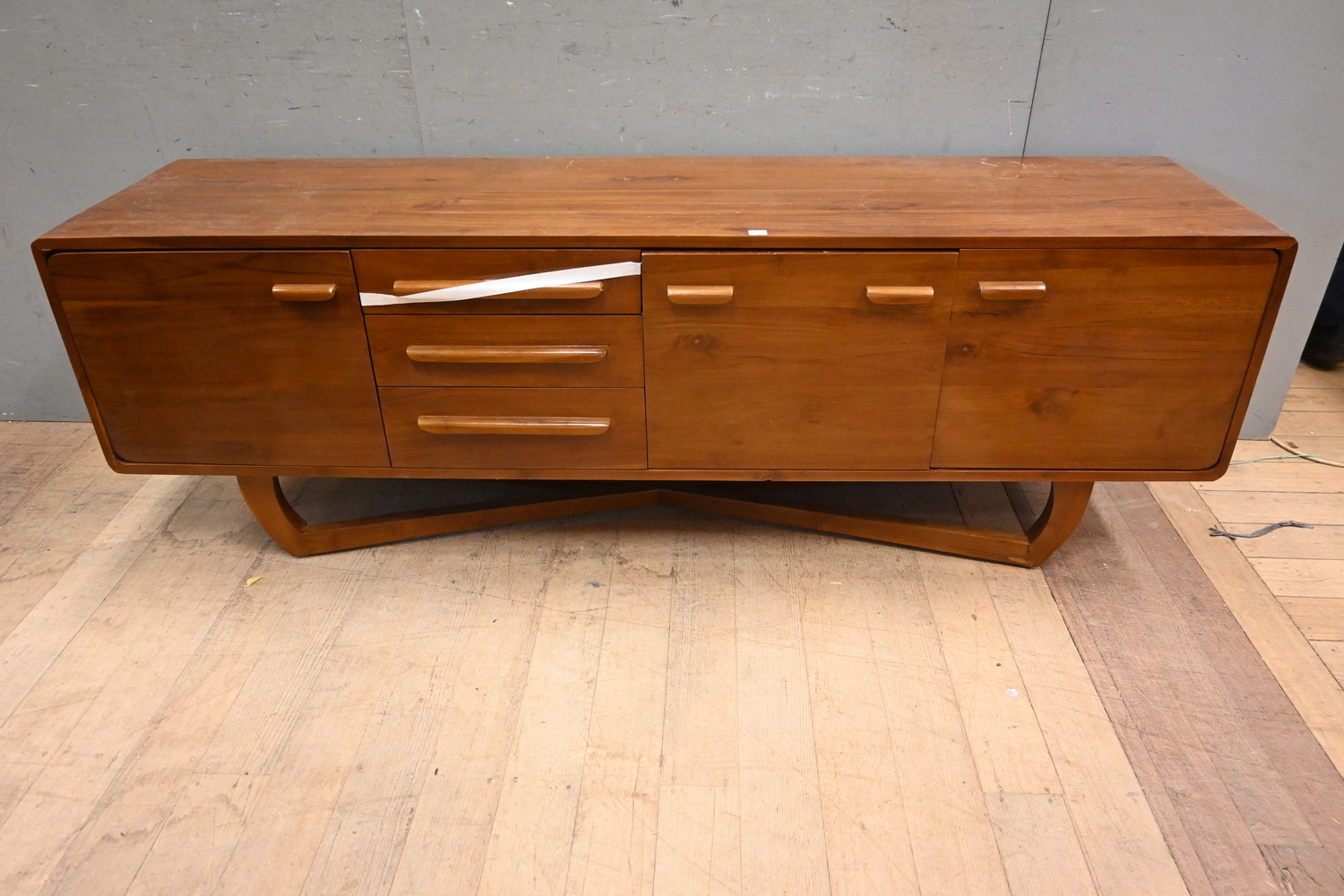 A MID CENTURY STYLE TEAK SIDEBOARD ON SLEIGH BASE (A/F) (DAMAGED DRAWER ) (62H X 180W X 45D CM) (PLEASE NOTE THIS HEAVY ITEM MUST BE REMOVED BY CARRIERS AT THE CUSTOMER'S EXPENSE. LEONARD JOEL STAFF CANNOT ASSIST CARRYING THIS ITEM) (X-LARGE ITEM)