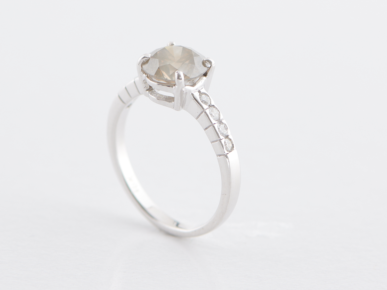A DIAMOND RING IN 18CT WHITE GOLD, THE CENTRAL ROUND BRILLIANT CUT DIAMOND MEASURING 1.80CTS (SI1), WITH SHOULDERING DIAMONDS TOTALLING 0.10CTS (H,VS2/SI1), RING SIZE L, WITH VALUATION