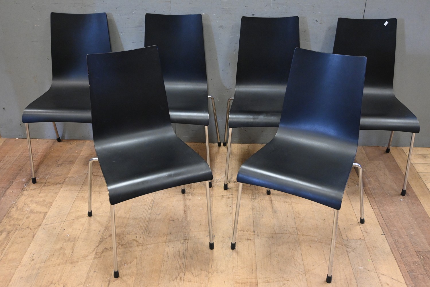 A SET OF SIX CHROME AND BLACK PLYWOOD CHAIRS (A/F) (H85 X W45 X D53 CM) (LEONARD JOEL DELIVERY SIZE: LARGE)