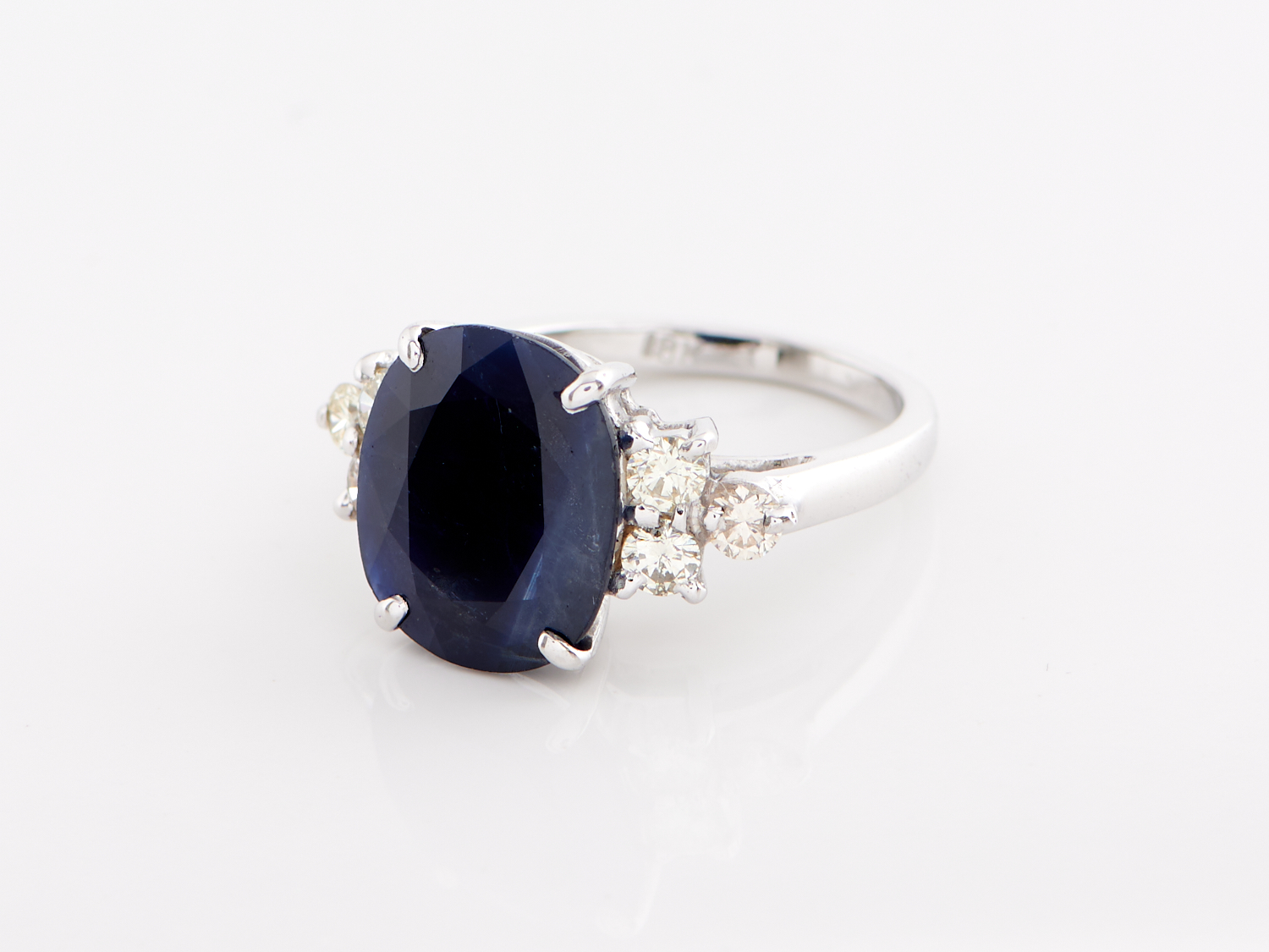 A SAPPHIRE AND DIAMOND RING IN 18CT WHITE GOLD, RING SIZE M, THE SAPPHIRE TOTALLING 8.70CTS, THE DIAMONDS TOTALLING 1.25CTS, ACCOMPA...