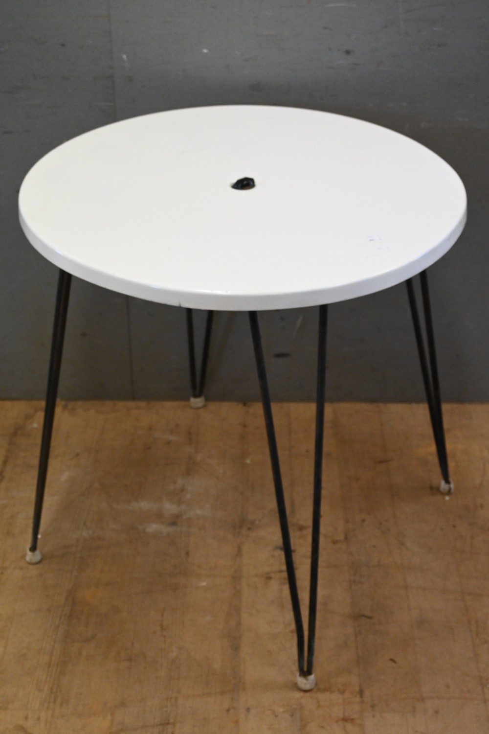 AN AUSTRALIAN 1950'S FIBREGLASS OUTDOOR TABLE WITH HAIRPIN LEGS (A/F) (H76 X D76 CM) (LEONARD JOEL DELIVERY SIZE: LARGE)