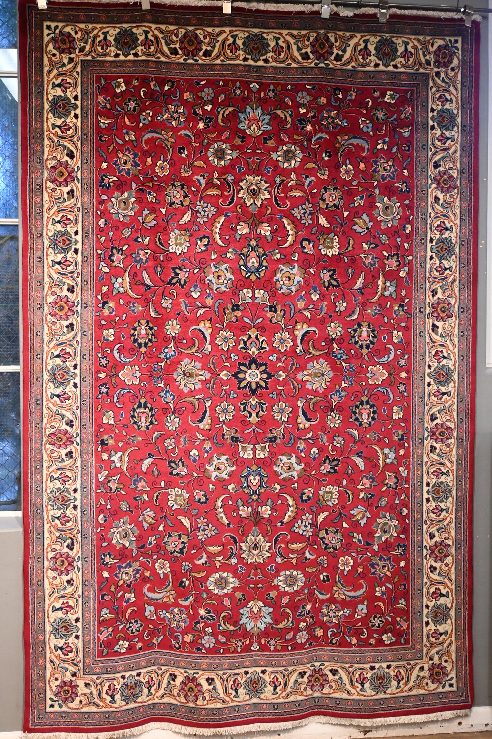 A BEAUTIFUL PERSIAN SOLID & DENSE FINE WEAVE MASHAD RUG, FROM THE KHORASAN PROVINCE 100% WOOL PILE AND HARD-WEARING. ALL OVER FLORAL DESIGN OF SHA ABBASI PALMETTES IN A FRENCH BLUE TONE AND TENDRILS ON A DEEP RED FIELD. BORDER OF PALMETTES ON A CREAM FIELD. IN PRISTINE CONDITION. SIZE: 304 X 196 CM ORIGIN: PERSIA - RRP: $4,700 DOCUMENTATION OF AUTHENTICITY INCLUDED.