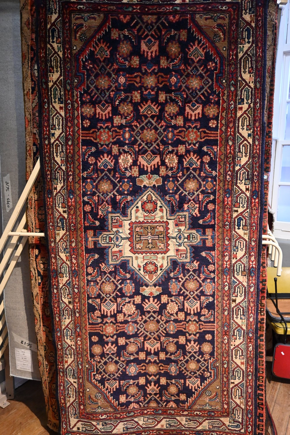 A PERSIAN ENJELAS RUG 100% WOOL. HAND-KNOTTED VILLAGE WEAVE FROM THE HAMADAN REGION WITH TRIBAL DESIGN OF CENTRAL MEDALLION IN A CHARCOAL FIELD OF HERATI MAHI PATTERN. BORDER OF GEOMETRIC PATTERNS. SIZE: 235 X 110CM - RRP: $1,400- ORIGIN: PERSIA DOCUMENTATION OF AUTHENTICITY INCLUDED.