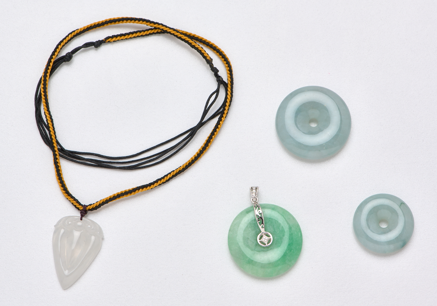 A COLLECTION OF FOUR JADE SET PENDANTS, INCLUDING ONE TO AN ADJUSTABLE ROPE NECKLACE AND ONE DIAMOND SET IN 18CT WHITE GOLD