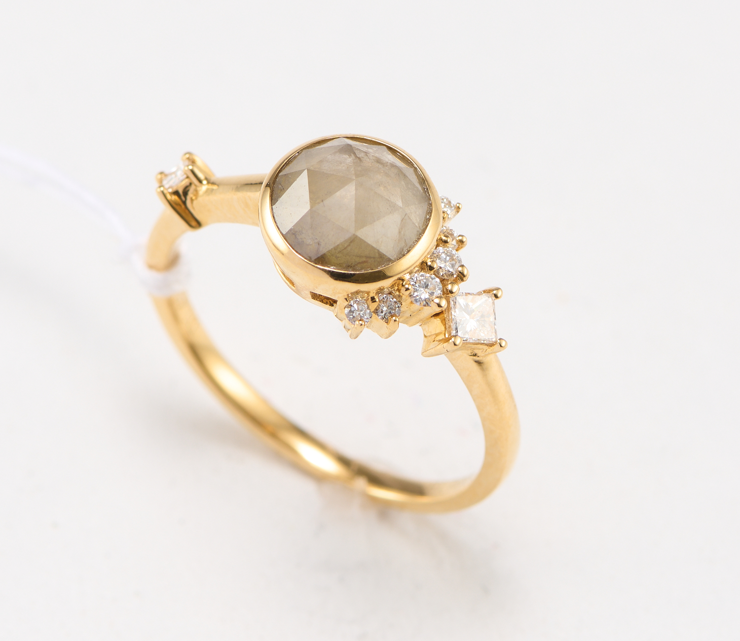 A SALT AND PEPPER DIAMOND AND DIAMOND SET RING IN 18CT GOLD, RING SIZE L, 2.85GMS