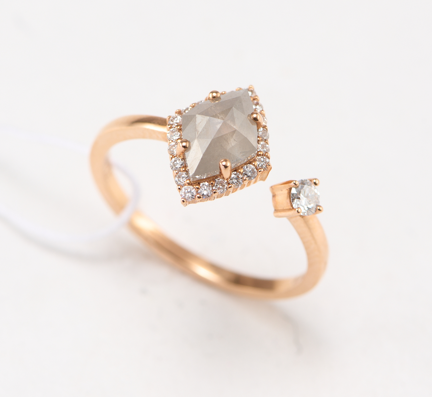 A SALT AND PEPPER DIAMOND AND DIAMOND SET RING IN 18CT ROSE GOLD, RING SIZE J/K, 2.17GMS
