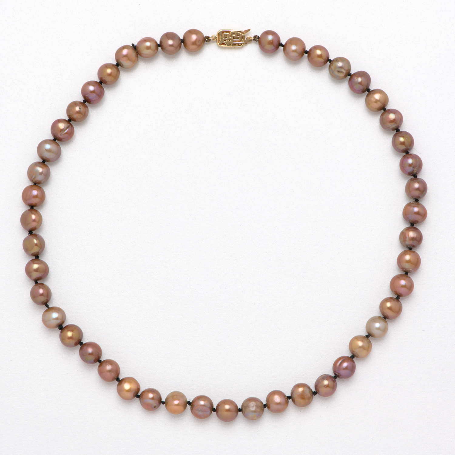 A FRESHWATER PEARL NECKLACE WITH CLASP IN 14CT GOLD, THE PEARLS AVERAGING APPROXIMATELY 8.90MM, 470MM