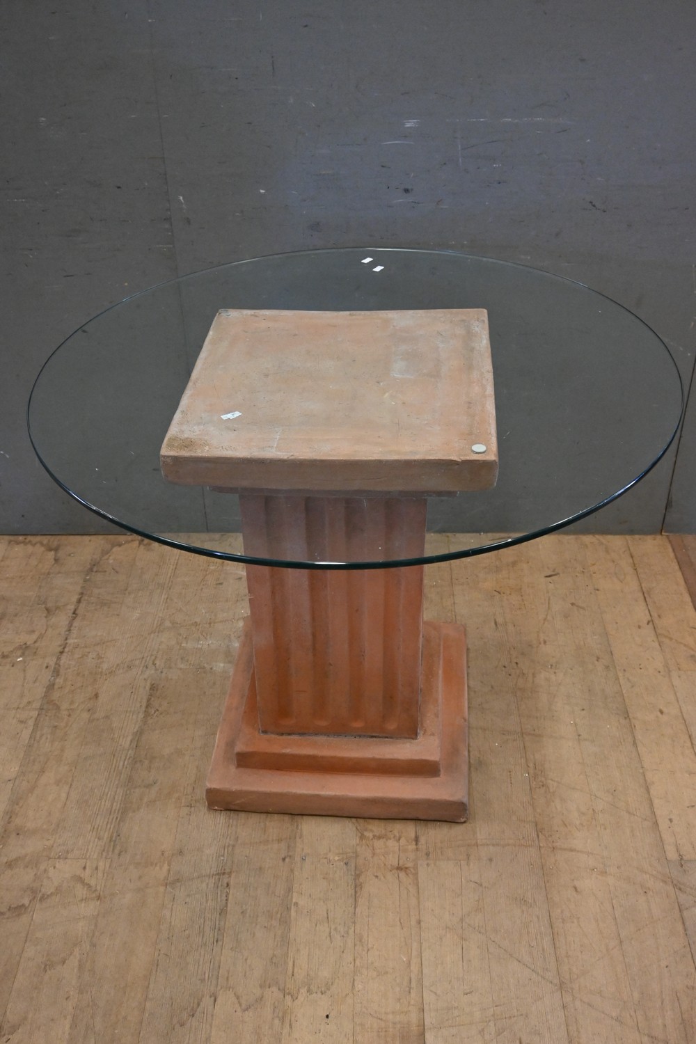 A CLASSICAL STYLE GLASS TOP PEDESTAL TABLE ( 78H X 101 DIAMETER CM) (PLEASE NOTE THIS HEAVY ITEM MUST BE REMOVED BY CARRIERS AT THE CUSTOMER'S EXPENSE. LEONARD JOEL STAFF CANNOT ASSIST CARRYING THIS ITEM) (X-LARGE ITEM)