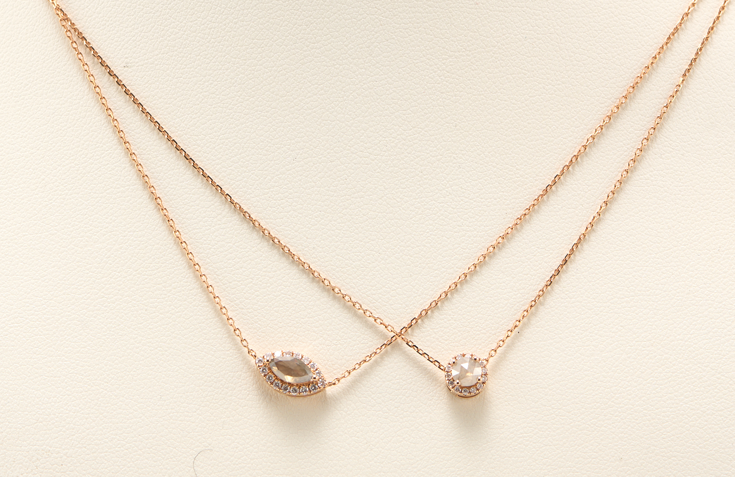 TWO DIAMOND SET PENDANT NECKLACES IN 18CT ROSE GOLD, THE PENDANTS MEASURING APPROXIMATELY 11 X 5.94 AND 5.97MM IN DIAMETER, 4.06GMS
