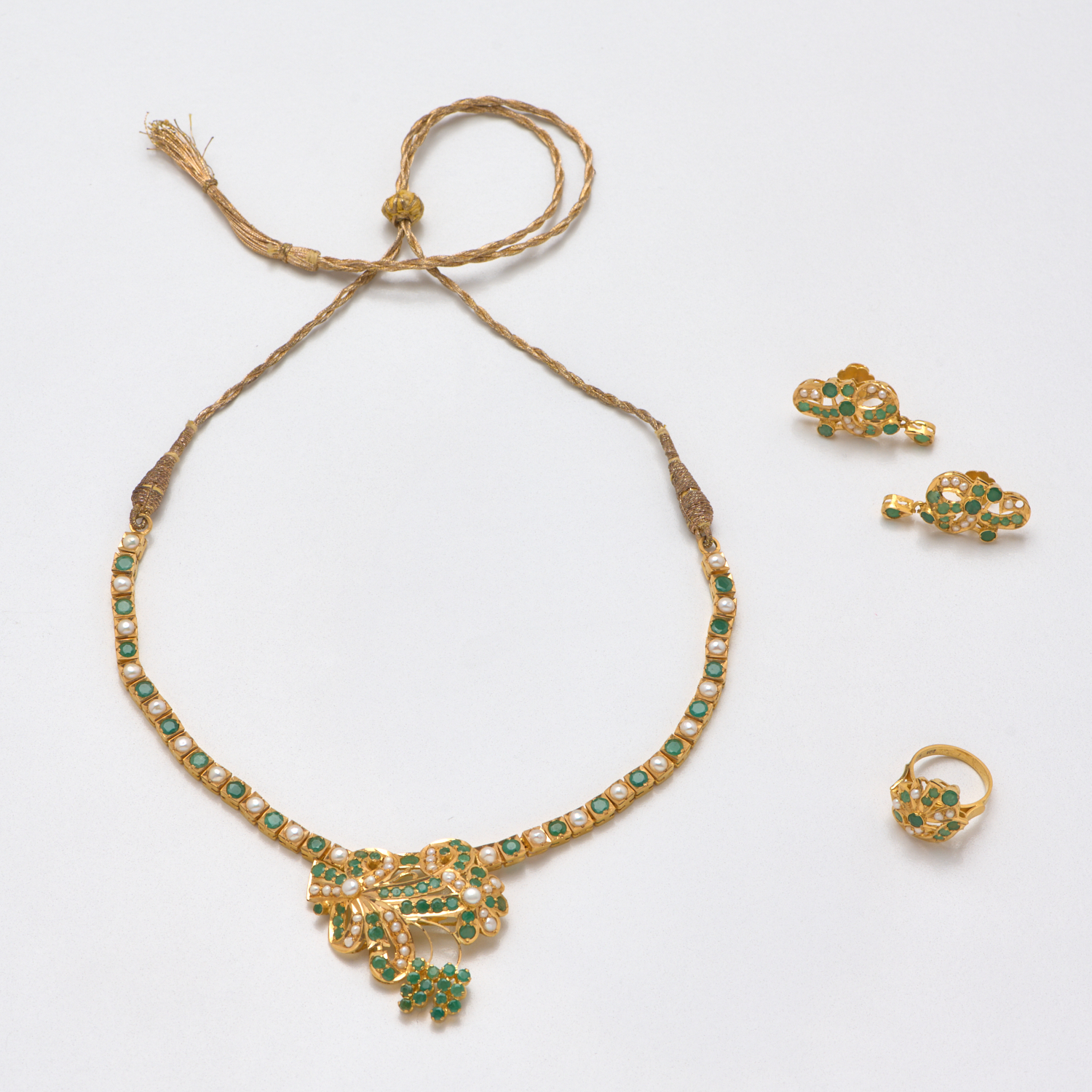 AN EMERALD AND PEARL SUITE IN 20CT GOLD, COMPRISING A NECKLACE TO A CHORD FASTENING, RING AND EARRINGS TO SCREWBACK FITTINGS, TOTAL WEIGHT APPROXIMATELY 55.8GMS