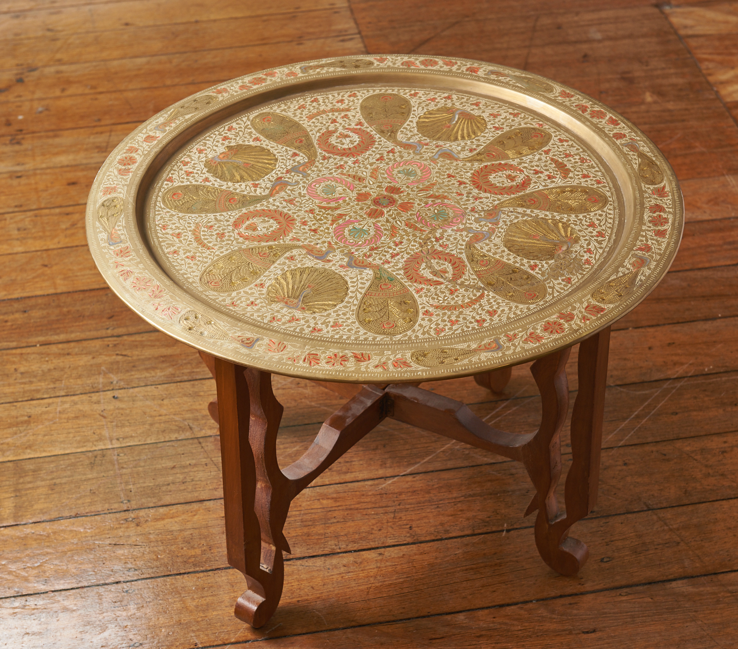 A BRASS TRAY WITH EMBOSSED BIRD DECORATION ON FOLDING TIMBER BASE H.40CM X DIA.58CM, LEONARD JOEL LOCAL DELIVERY: MEDIUM