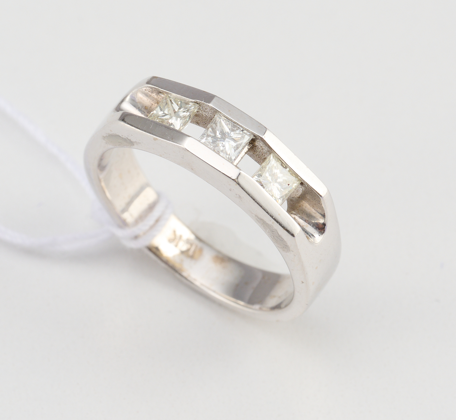 A THREE STONE PRINCESS CUT DIAMOND RING IN 14CT GOLD, RING SIZE N/O, 5.3GMS