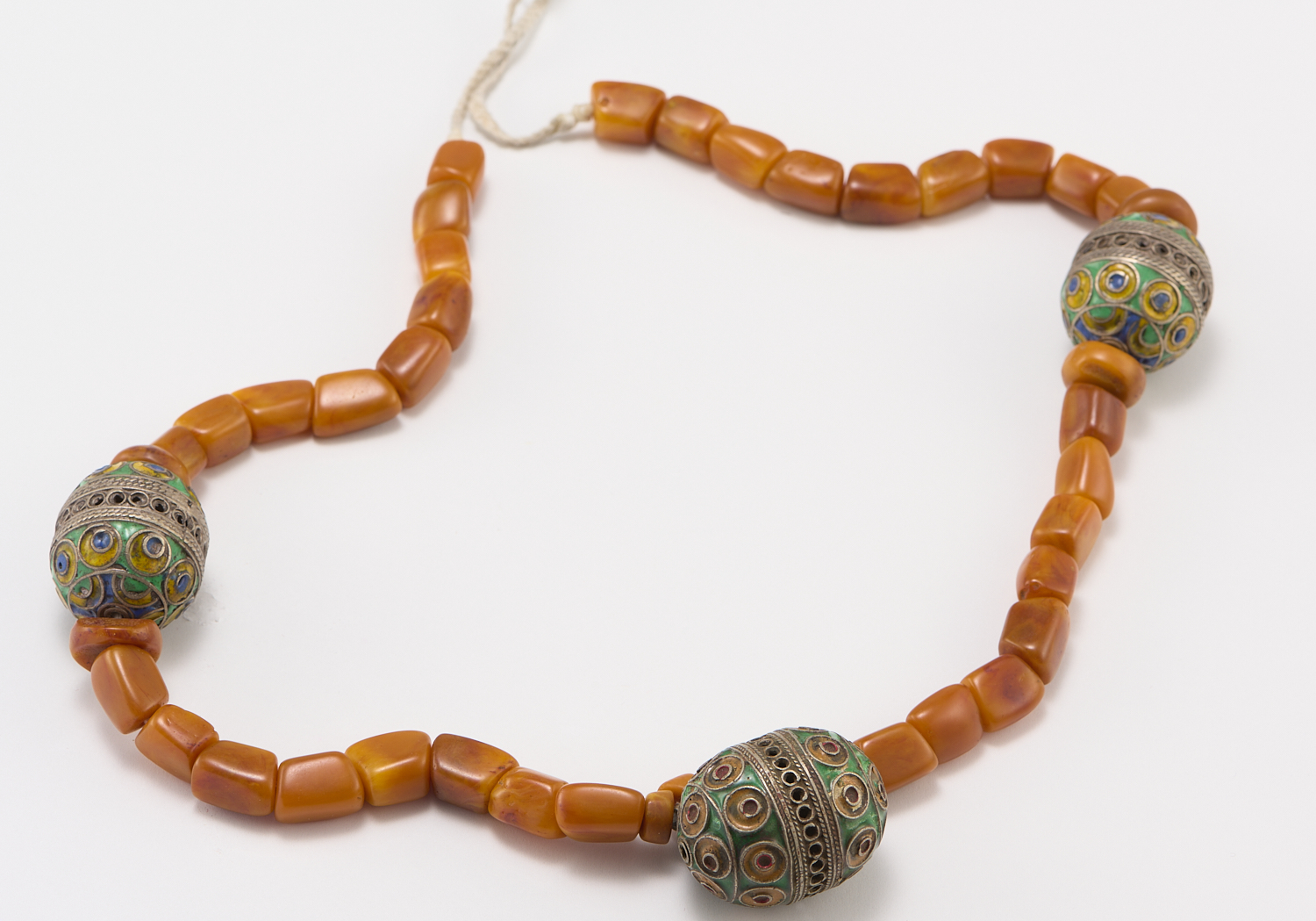 A MOROCCON AMBER NECKLACE, FEATURING LARGE ENAMEL SET SPACERS, LENGTH 900MM