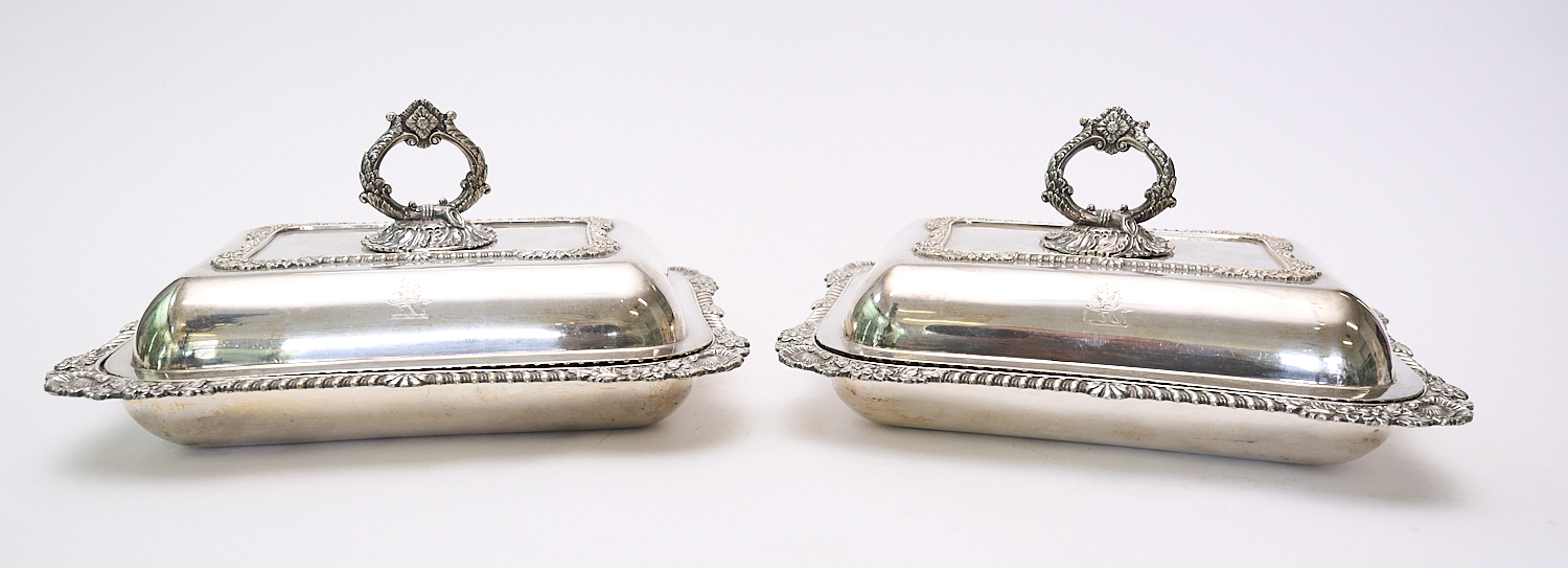 A PAIR OF GEORGIAN SHEFFIELD PLATE TUREENS WITH ARMORIAL CRESTS TO LIDS W.31CM, LEONARD JOEL LOCAL DELIVERY: MEDIUM