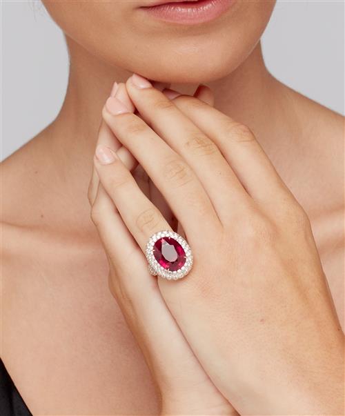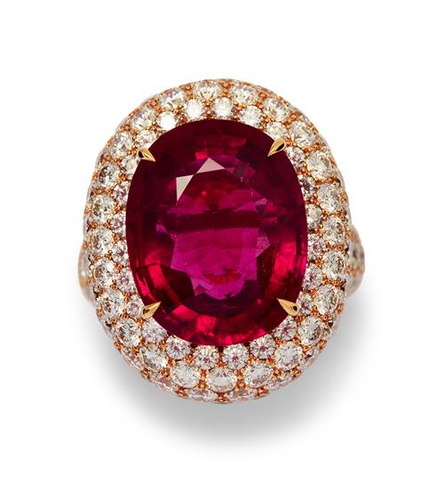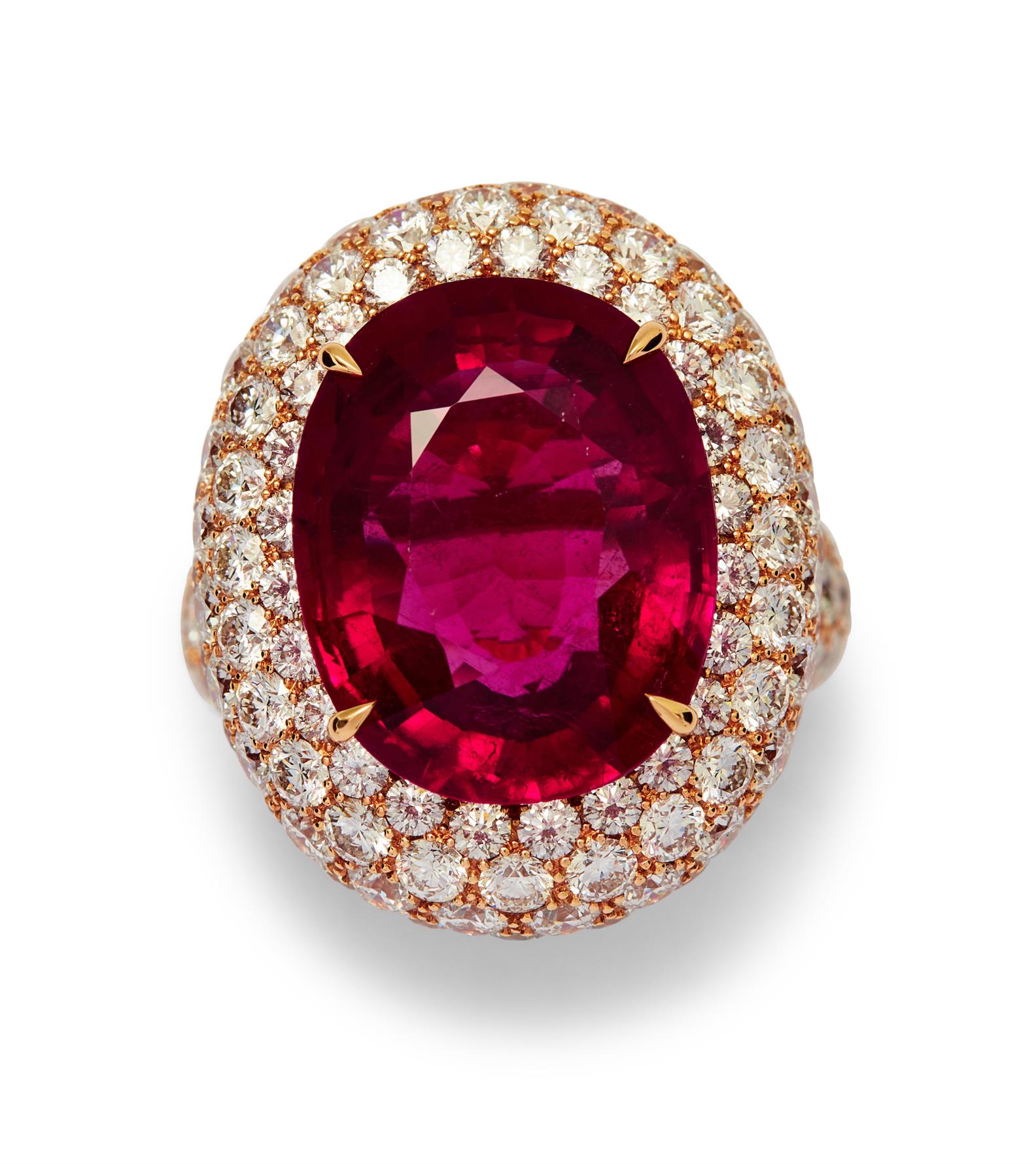 Of cluster design, centring a claw-set oval pink tourmaline weighing 10.13 carats, framed by pavé-set diamonds, the diamonds together weighing 6.69 carats, mounted in 18ct pink gold, size M.
