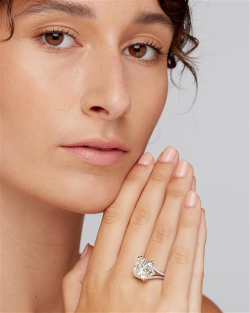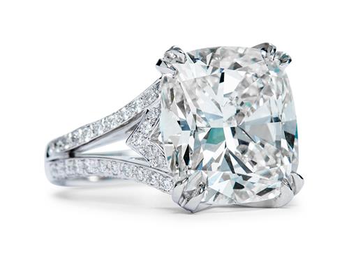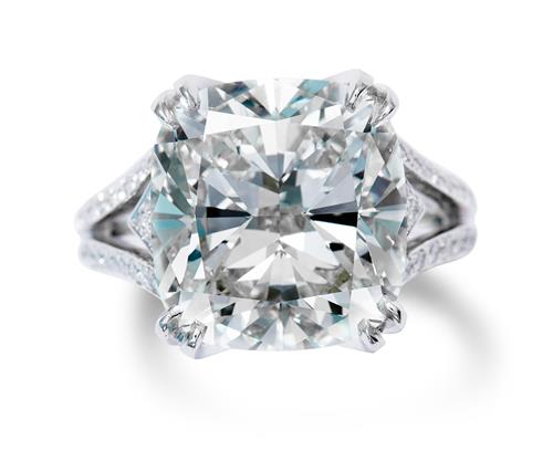 Claw-set with a cushion brilliant-cut diamond weighing 10.02 carats, above a gallery and split shoulders pavé-set with brilliant-cut diamonds, the small diamonds together weighing 0.91 carats, mounted in platinum, size L1/2.