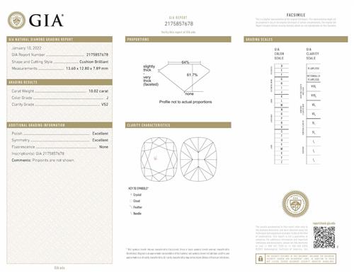 Accompanied by a GIA report numbered 2175857678, dated 10 January 2022, stating that the 10.02 carat diamond is natural, J colour, VS2 clarity, laser inscribed.