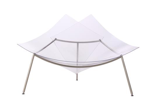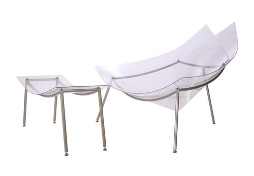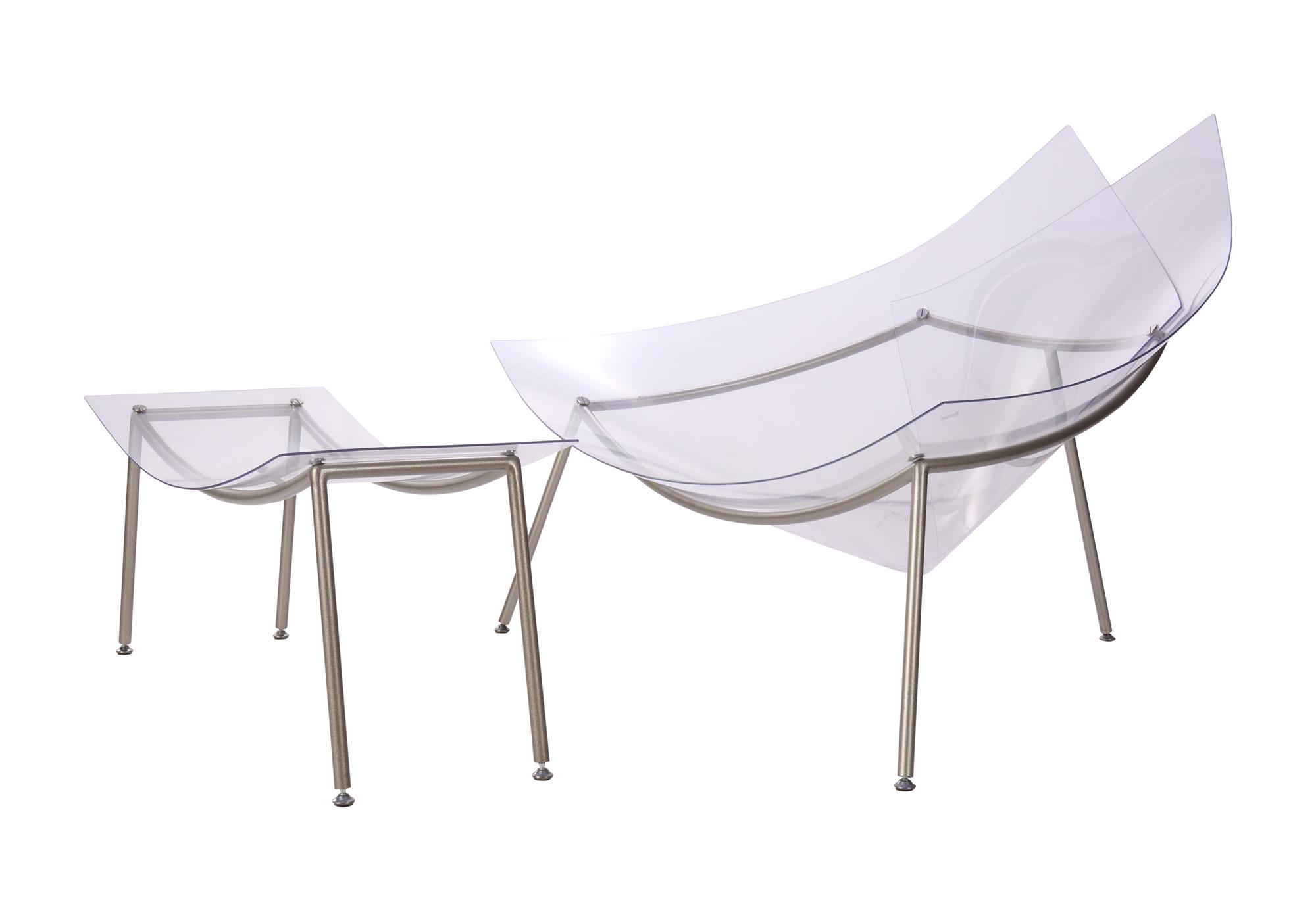 Minor marks, stains, and surface scratches present, all consistent with the age and previous use of the chair & ottoman. Some signs of aging, use, and sun exposure to the clear plastic. Slight signs of patina to feet and steel legs. Some minor abrasions to the plastic along the edges. Both the chair and ottoman are structurally sound. No major losses to either.