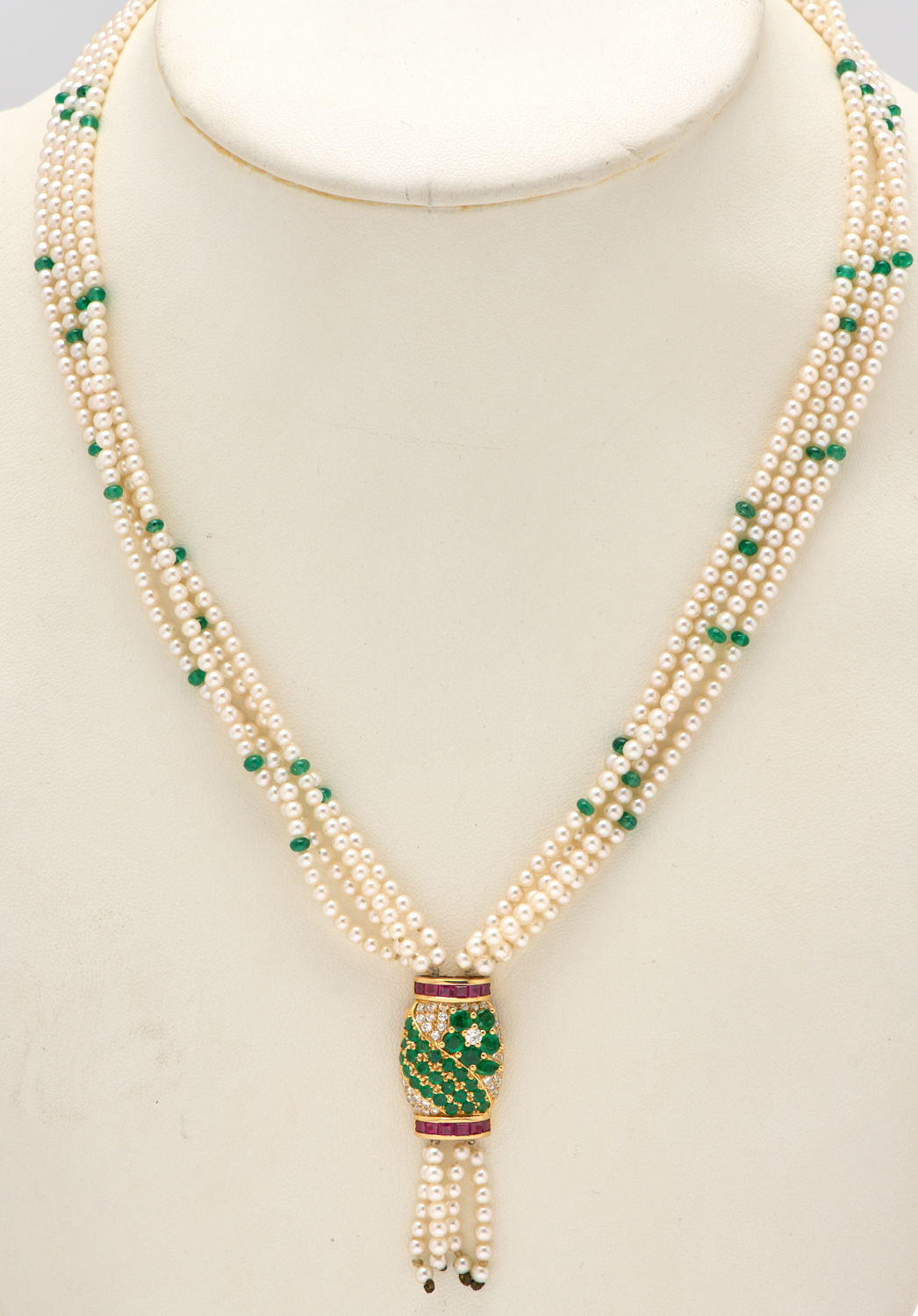 A SEED PEARL, RUBY, EMERALD AND DIAMOND NECKLACE TO PENDANT AND CLASP IN 18CT GOLD, LENGTH 450MM, WITH VALUATION