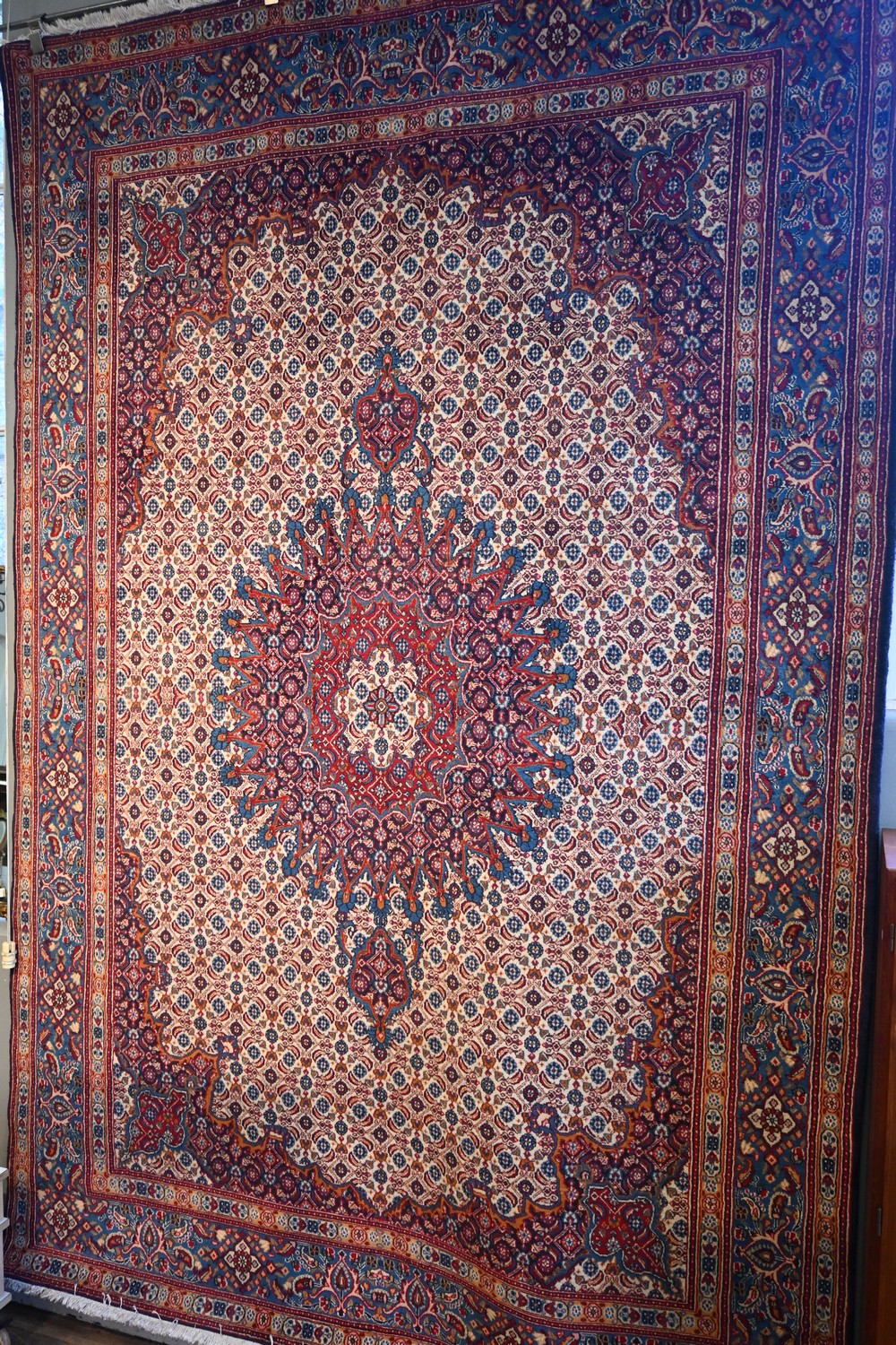 A VERY INTRICATE HAND-KNOTTED PERSIAN BIRJAND MOOD CARPET, 100% WOOL. SOLID & DENSE PILE. CLASSIC MOOD DESIGN OF SUNBURST MEDALLION & QUARTERED CORNER MEDALLIONS IN A FIELD OF FLORAL HERATI MAHI PATTERNS. BORDER OF ROSETTES AND HERATI PATTERNS. WITH BEAUTIFUL TONNES OF BLUE, REDS AND CREAM. SIZE: 305 X 205 CM ORIGIN: PERSIA - RRP: $4,900 DOCUMENTATION OF AUTHENTICITY INCLUDED.