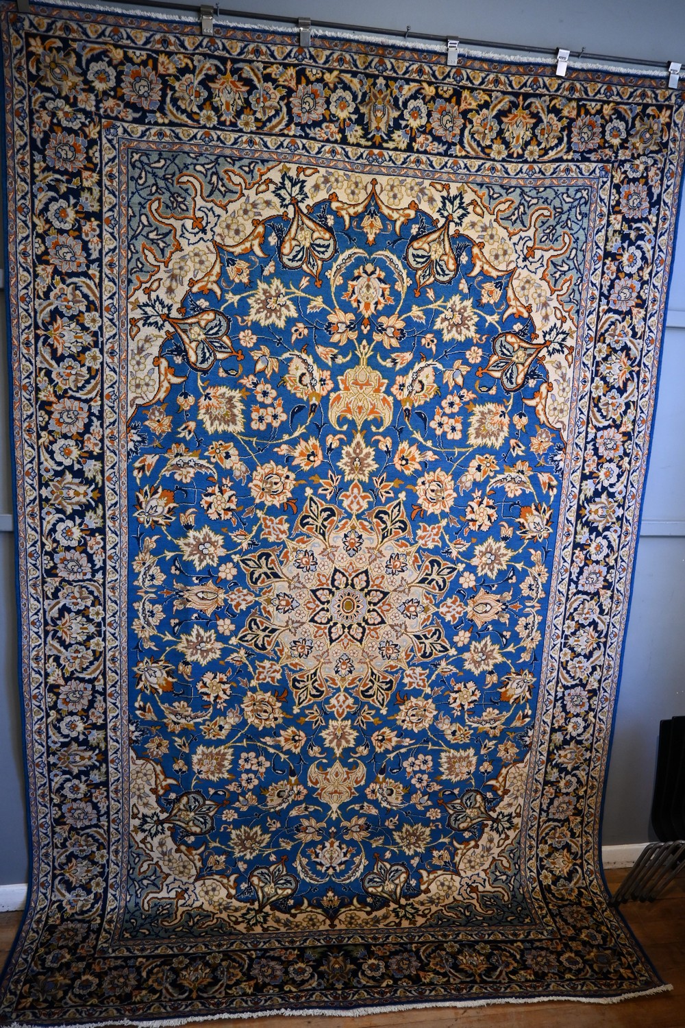 A FABULOUS PERSIAN KASHAN IN UNIQUE COLOUR TONES. A VIBRANT SUNBURST MEDALLION ON A BACKGROUND OF AZURE BLUE. WITH PALMETTES AND FLORAL SPRAYS. A BORDER OF PALMETTES AND ROSETTES ON A PERSIAN BLUE FIELD. IN PRISTINE CONDITION. SIZE: 370 X 240 CM ORIGIN: PERSIA - RRP: $8,500 DOCUMENTATION OF AUTHENTICITY INCLUDED.