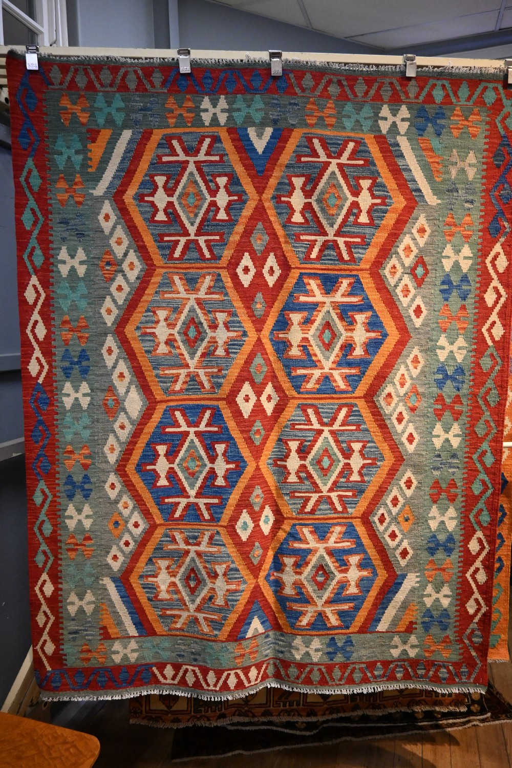A NEW COLOURFUL & DECORATIVE KILIM KAFKAZI RUG. 100% PURE HAND SPUN WOOL, HAND WOVEN. REVERSABLE, CAUCASIAN INFLUENCE AND DESIGN. SIZE: 203 X 156 CM- RRP: $1,300 ORIGIN: AFGHANISTAN/PESHWER BORDER DOCUMENTATION OF AUTHENTICITY INCLUDED