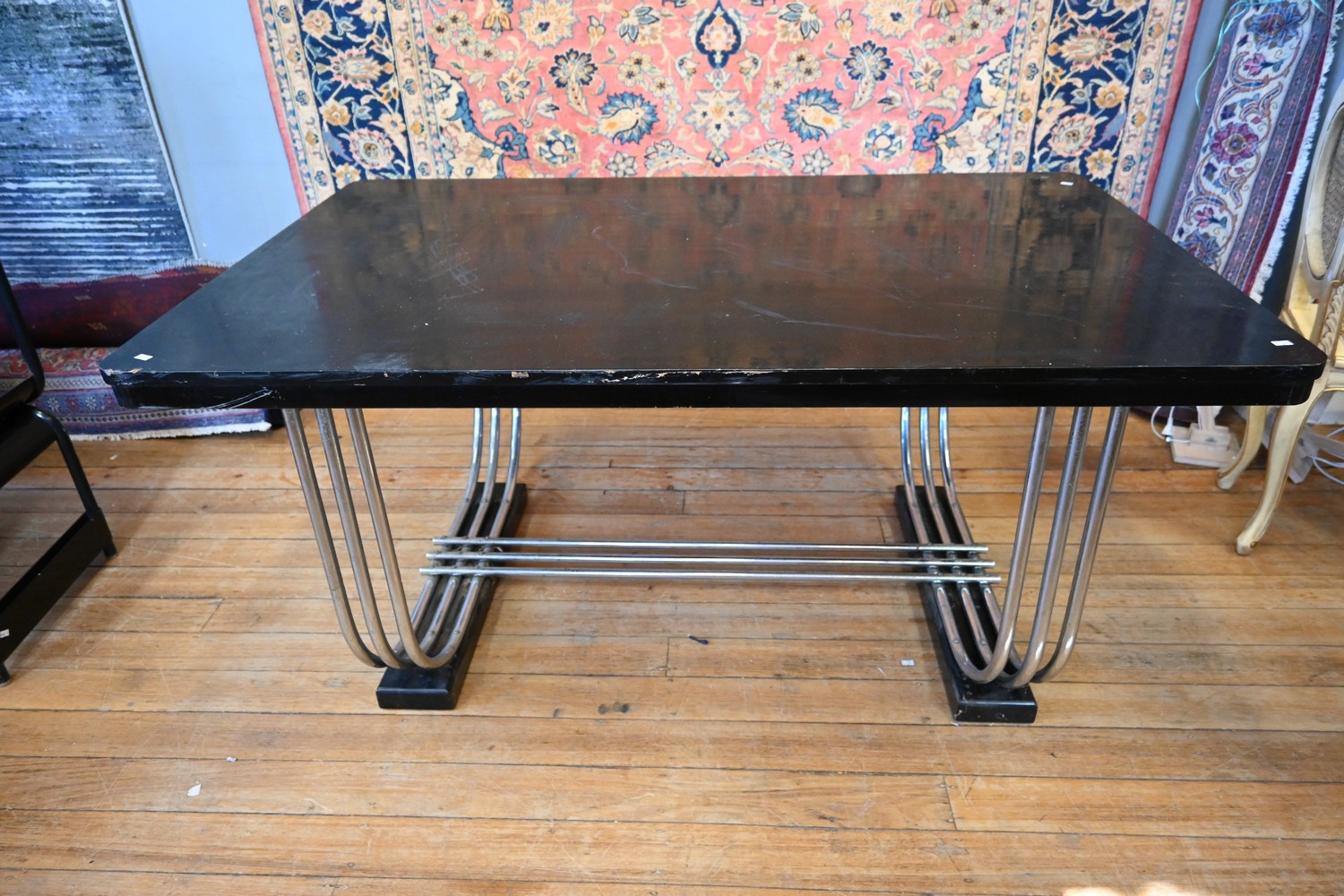 AN ART DECO AND LATER DINING TABLE WITH CHROME BASE (A/F) (76H X 158W X 99D CM) (PLEASE NOTE THIS HEAVY ITEM MUST BE REMOVED BY CARRIERS AT THE CUSTOMER'S EXPENSE. LEONARD JOEL STAFF CANNOT ASSIST CARRYING THIS ITEM) (X-LARGE ITEM)