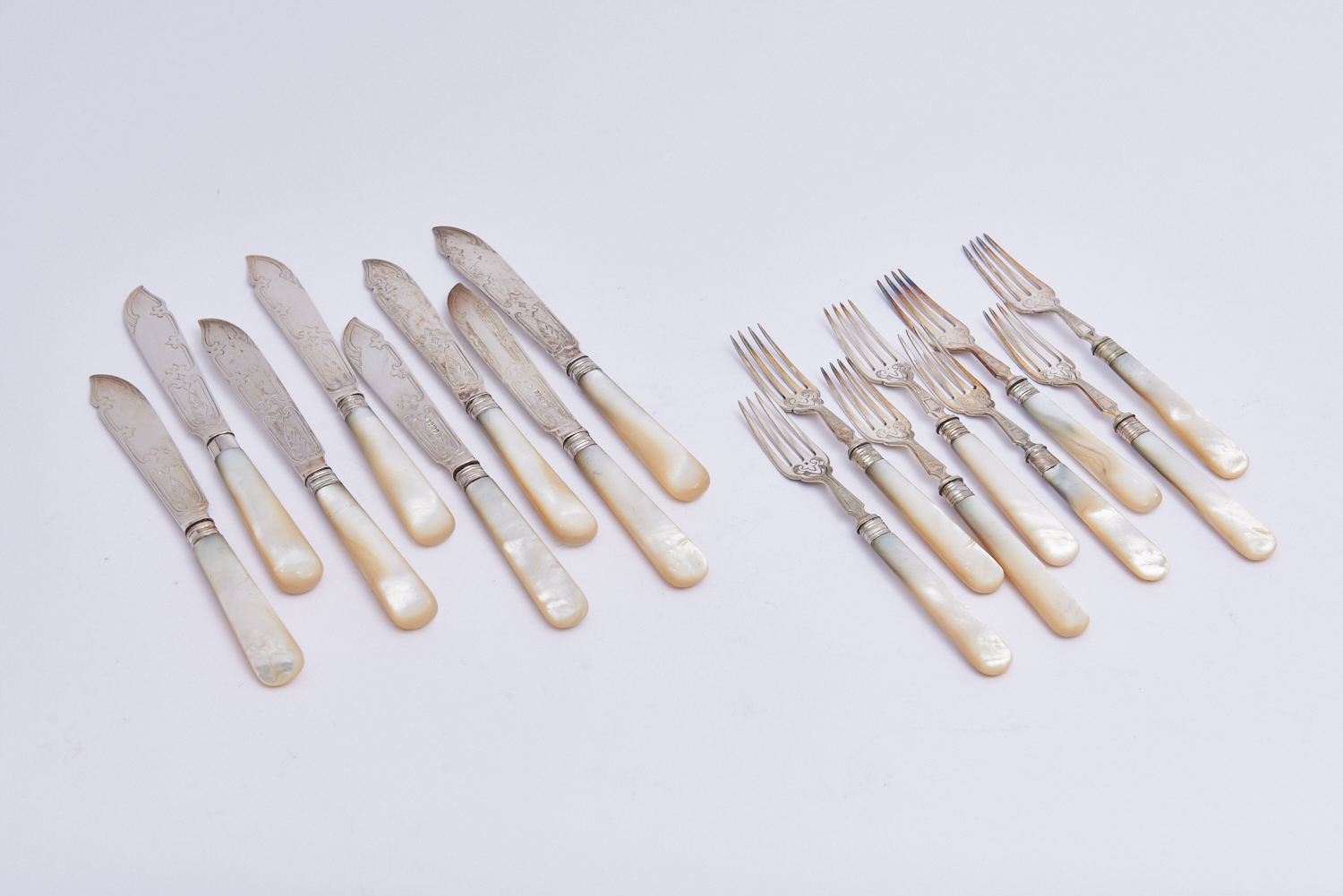 A STERLING SILVER SET OF FISH KNIVES AND FORKS WITH MOTHER OF PEARL HANDLES, LEONARD JOEL LOCAL DELIVERY: SMALL