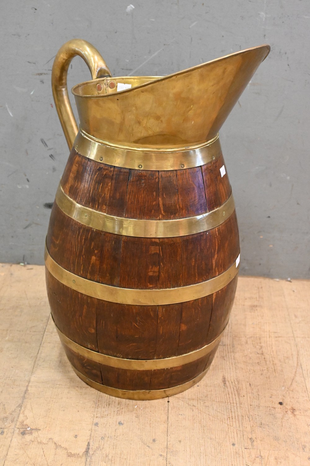 A COOPERED OAK AND BRASS MOUNTED TAVERN JUG ( 53H X 29 DIAMETER CM) (LEONARD JOEL DELIVERY SIZE: MEDIUM)
