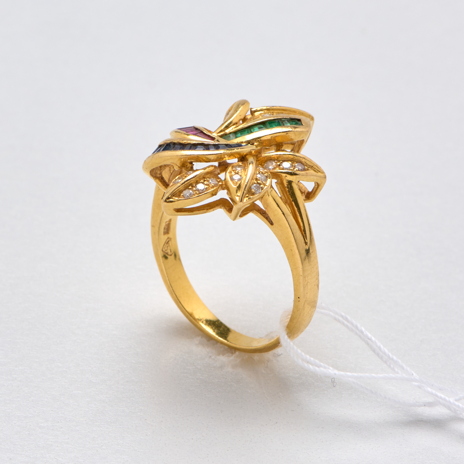 AN INDIAN GEM SET RING IN 18CT GOLD, RING SIZE O, 7.2GMS