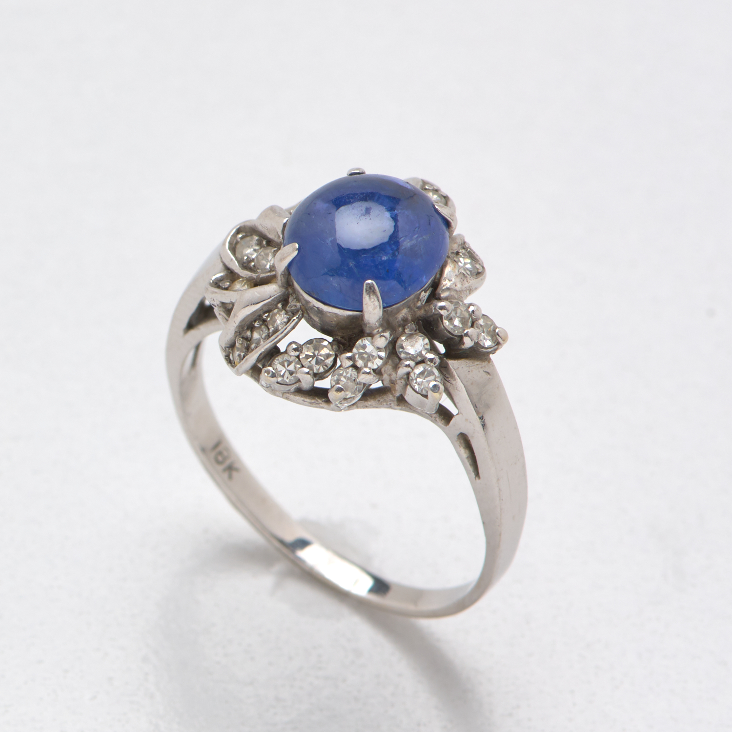 A CUT EN CABACHON SAPPHIRE AND DIAMOND SET RING IN 9CT WHITE GOLD, RING SIZE O, 4.3GMS