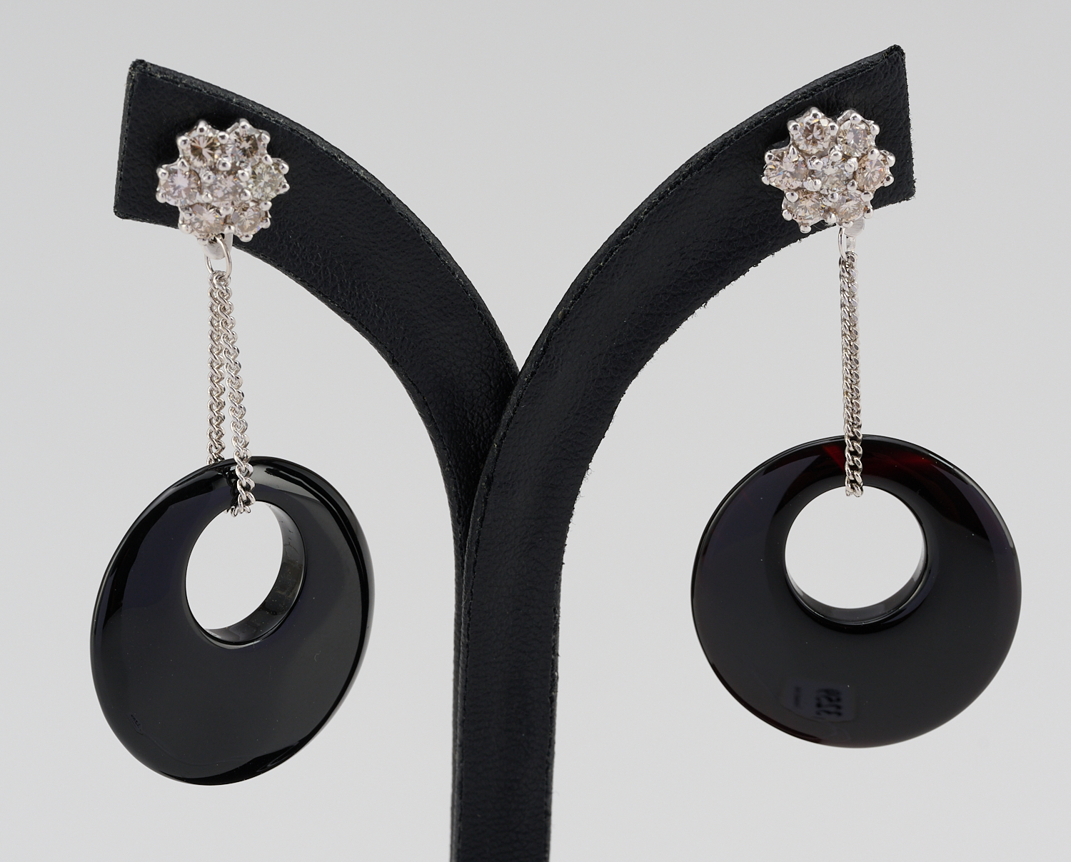 A PAIR OF DETATCHABLE ONYX AND DIAMOND SET EARRINGS IN 18CT WHITE GOLD, THE DIAMONDS TOTALLING 1.72CTS