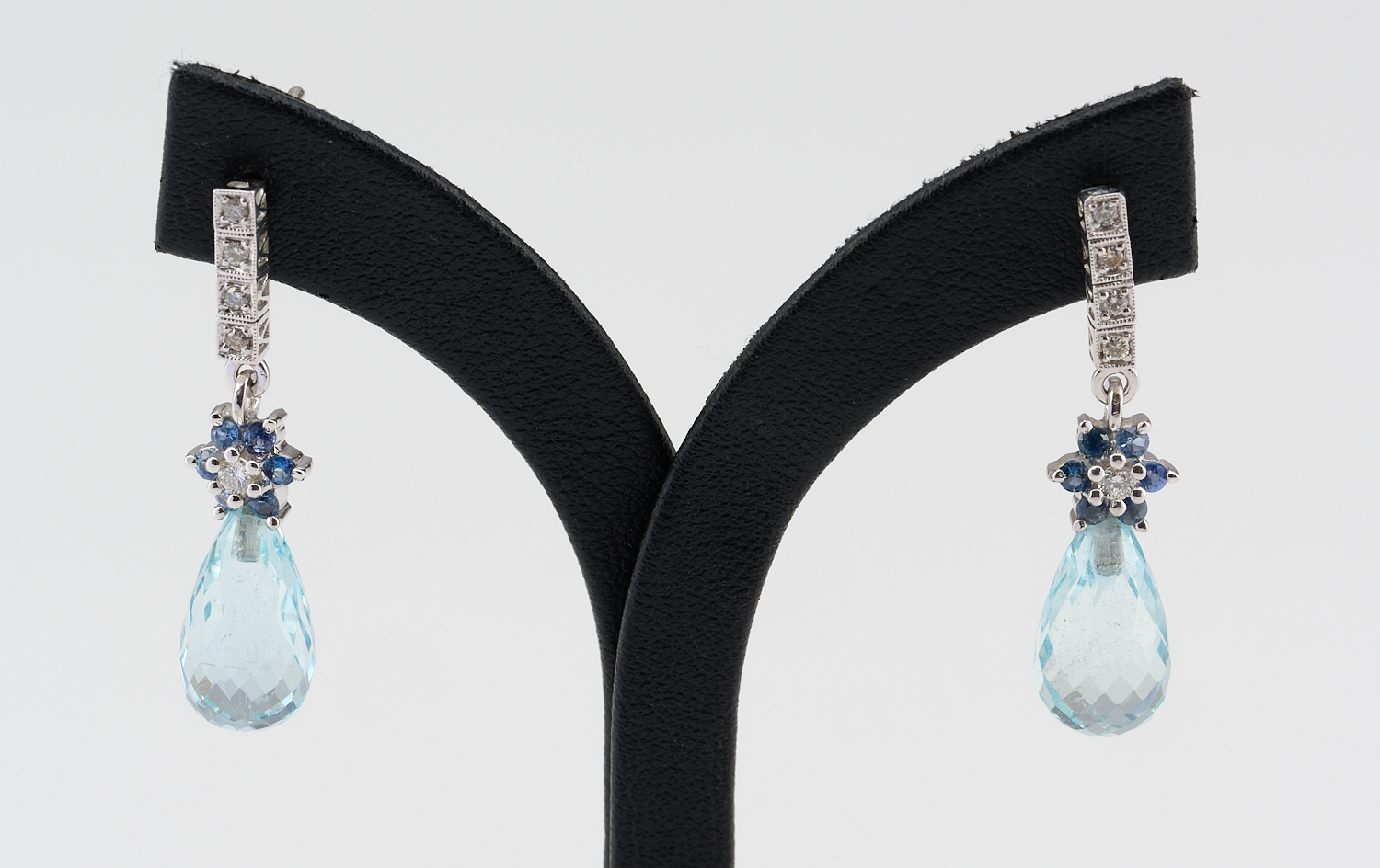 A PAIR OF BRIOLETTE AQUAMARINE, SAPPHIRE AND DIAMOND EARRINGS TO STUD AND BUTTERFLY FITTINGS IN 18CT WHITE GOLD, THE AQUAMARINES TOTALLING 11.28CTS, DROP LENGTH 34MM