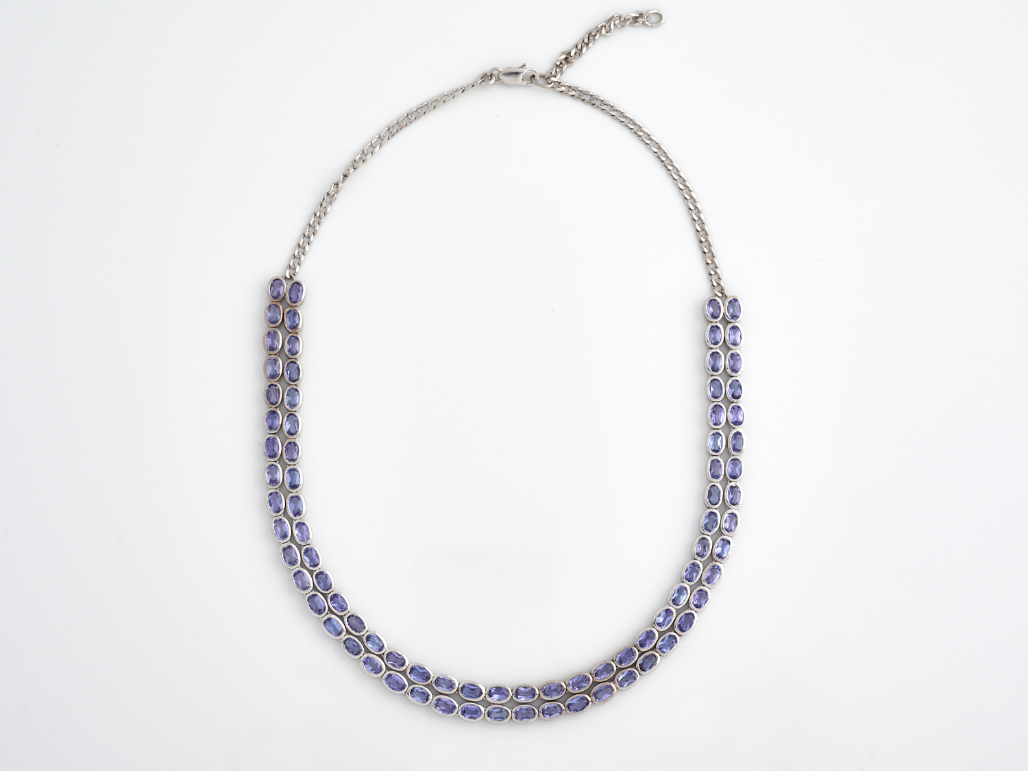 A TANZANITE SET NECKLACE IN 18CT WHITE GOLD, THE EIGHTY STONES TOTALLING 31CTS, TOTAL LENGTH APPROXIMATELY 420MM
