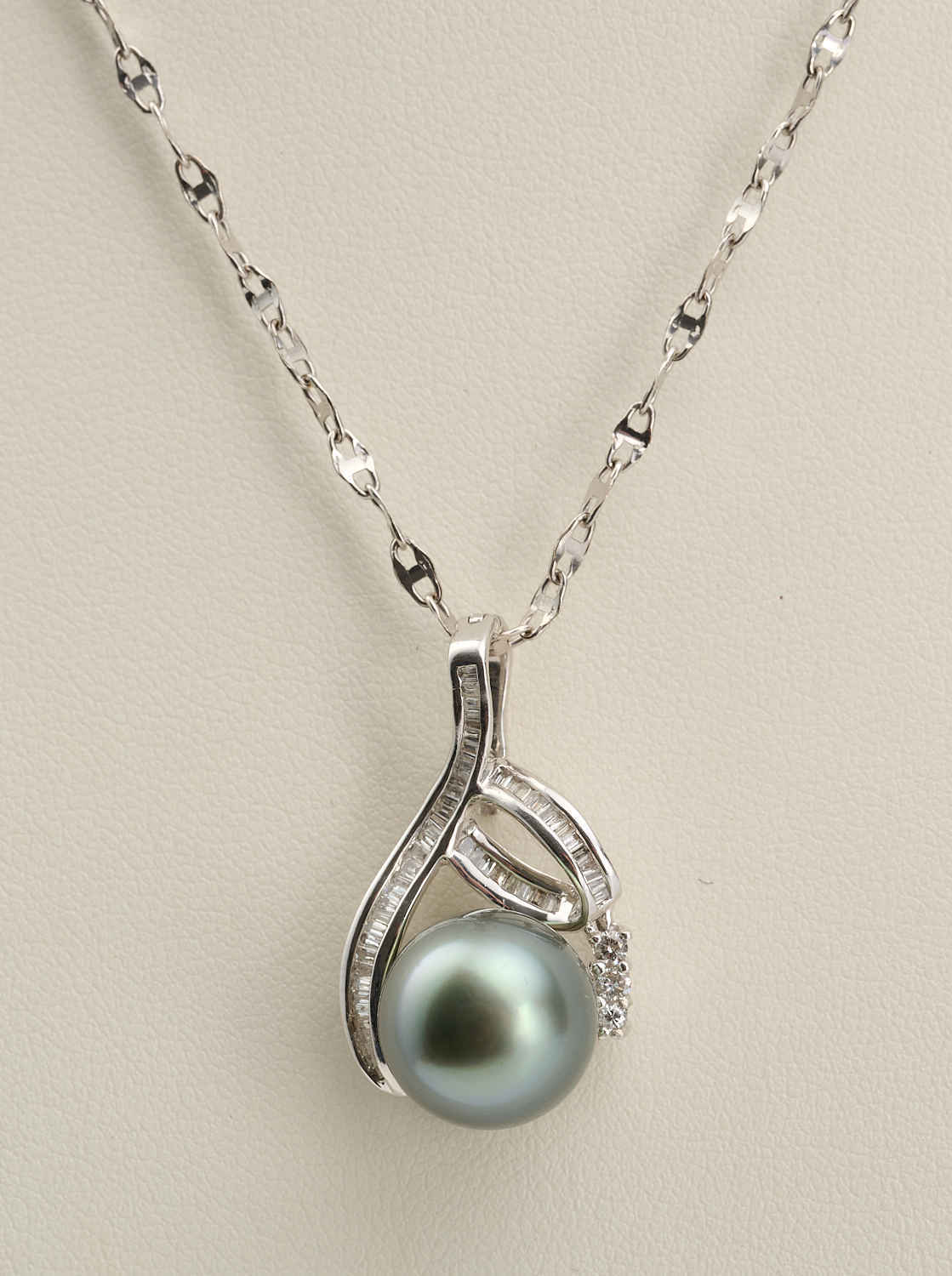 A TAHITIAN PEARL AND DIAMOND SET PENDANT IN 18CT WHITE GOLD TO A CHAIN IN 18CT WHITE GOLD, THE PEARL MEASURING 12.5MM