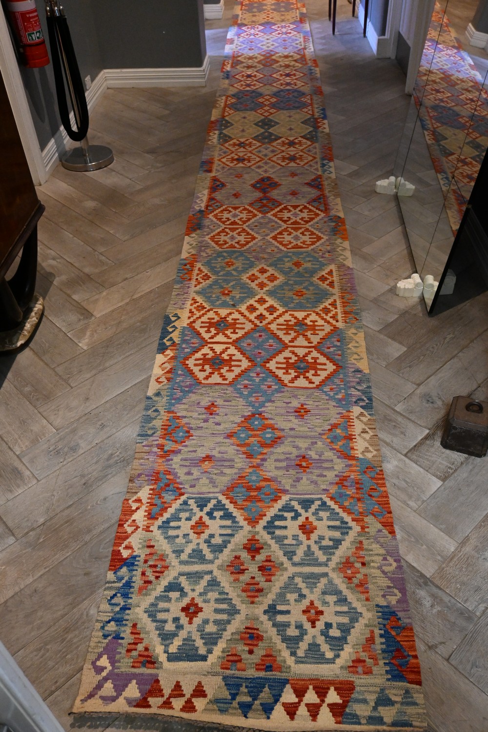 A HANDWOVEN KAZAK KILIM RUNNER, 100% WOOL IN NATURAL VEGETABLE DYES (970 X 85 CM) (LEONARD JOEL DELIVERY SIZE: LARGE)