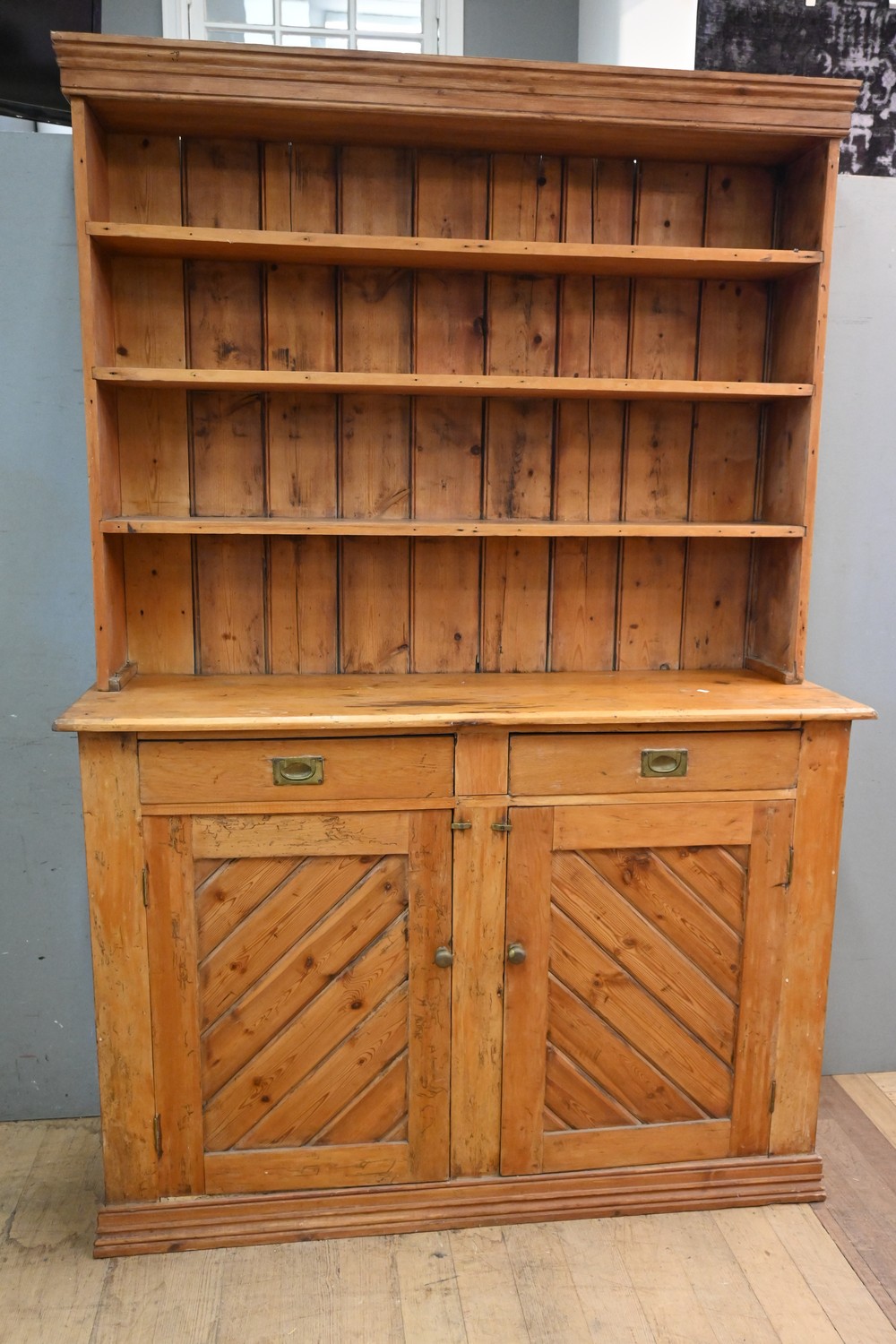 A LARGE PINE DOUBLE BODIED KITCHEN DRESSER (A/F) (220H X 149W X 47D CM) (PLEASE NOTE THIS HEAVY ITEM MUST BE REMOVED BY CARRIERS AT THE CUSTOMER'S EXPENSE. LEONARD JOEL STAFF CANNOT ASSIST CARRYING THIS ITEM) (X-LARGE ITEM)