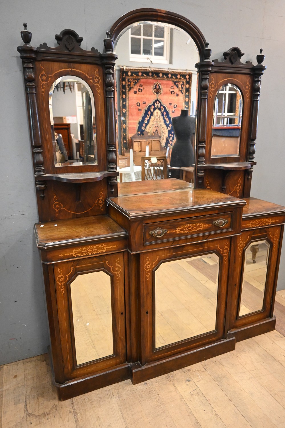 A 19TH CENTURY MIRROR BACKED SIDEBOARD WITH MARQUETRY INLAY (A/F) (193H X 150W X 43D CM) (PLEASE NOTE THIS HEAVY ITEM MUST BE REMOVED BY CARRIERS AT THE CUSTOMER'S EXPENSE. LEONARD JOEL STAFF CANNOT ASSIST CARRYING THIS ITEM) (X-LARGE ITEM)