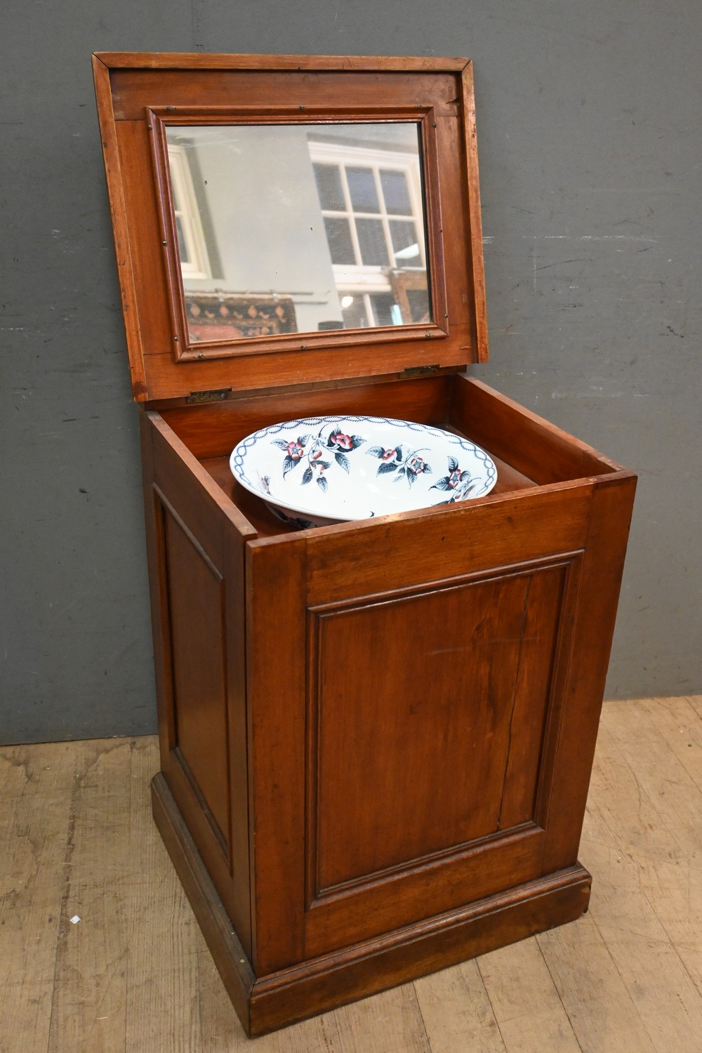 AN ANTIQUE FLIP-TOP WASHSTAND WITH BASIN (A/F) (128H X 82W X 58D CM) (LEONARD JOEL DELIVERY SIZE: X-LARGE)