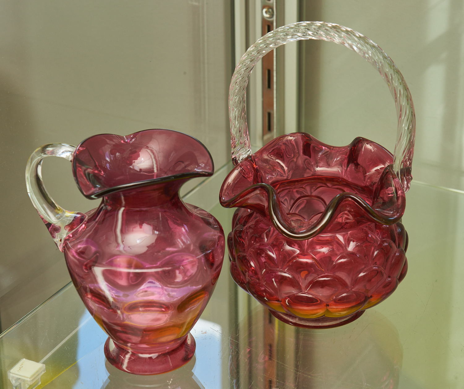 TWO CRANBERRY GLASS ITEMS H.22CM, LEONARD JOEL LOCAL DELIVERY: SMALL