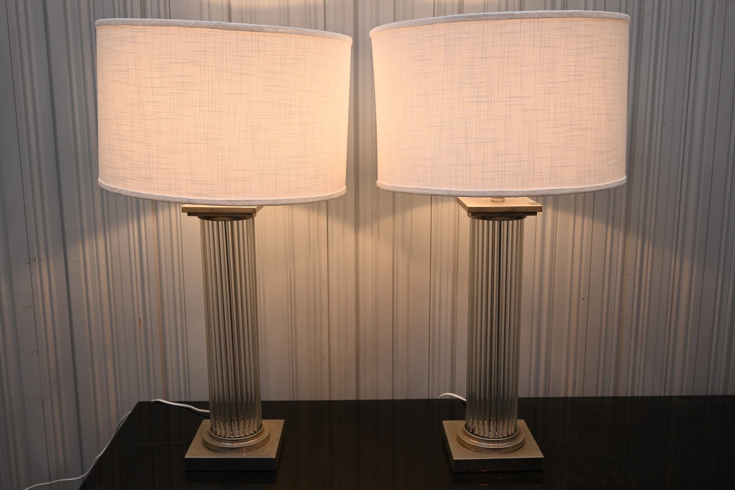 A PAIR OF CHROME AND GLASS EMPIRE LAMPS (A/F) (86H X 47D CM) (LEONARD JOEL DELIVERY SIZE: LARGE)