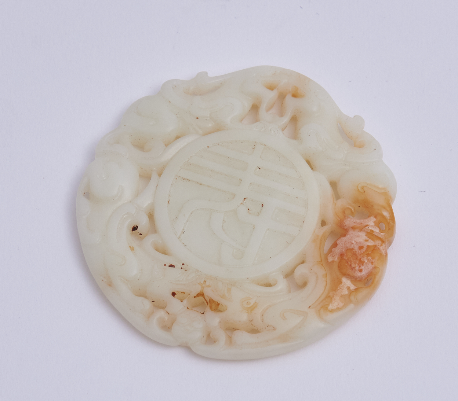 A HETIAN JADE ROUNDEL WITH CYPHER DIA.6.5CM, LEONARD JOEL LOCAL DELIVERY: SMALL