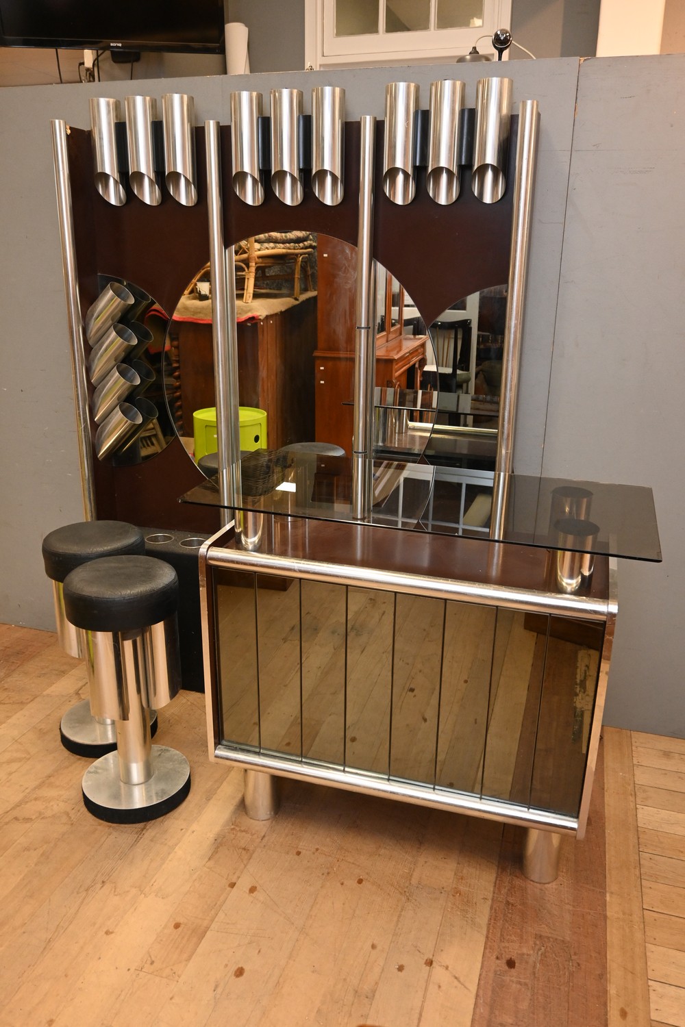 A MID CENTURY ITALIAN SPACE AGE BAR WITH MATCHING STOOLS, C.1960'S (A/F) (204H X 151W X 21D CM) (PLEASE NOTE THIS HEAVY ITEM MUST BE REMOVED BY CARRIERS AT THE CUSTOMER'S EXPENSE. LEONARD JOEL STAFF CANNOT ASSIST CARRYING THIS ITEM) (X-LARGE ITEM)