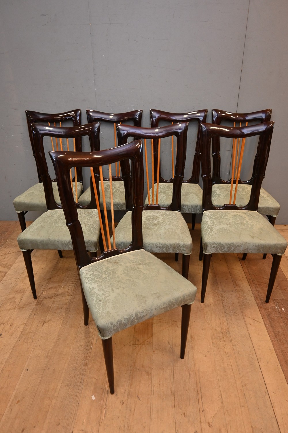 A SET OF EIGHT ITALIAN ART DECO DINING CHAIRS BY VITTORIO DASSI, C.1940'S (A/F) (103H X 47W X 61D CM) (LEONARD JOEL DELIVERY SIZE: X-LARGE)
