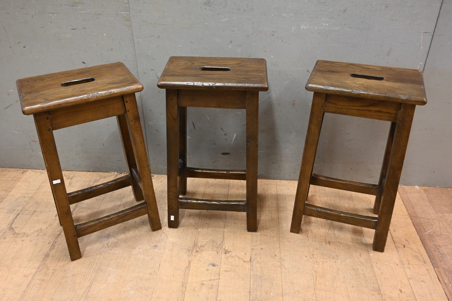 A SET OF THREE OAK LABORATORY STYLE BARSTOOLS (H62 X W36 X D25 CM) (LEONARD JOEL DELIVERY SIZE: LARGE)