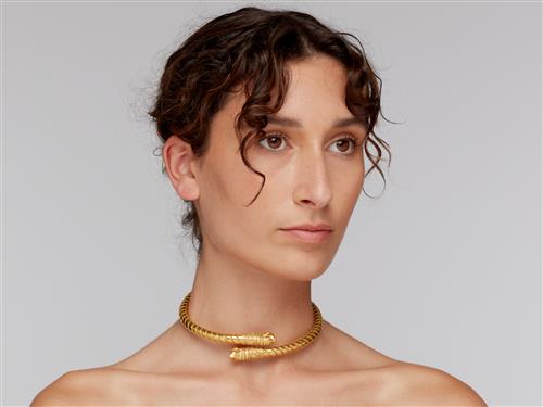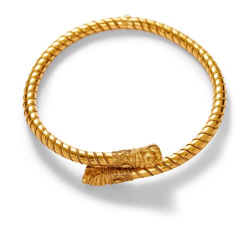 Modelled as a hinged cylindrical collar applied with rope twist terminating to the front in sculpted lion's heads, inner circumference 350mm, adjustable, gross weight approximately 76.30 grams, maker's mark for Ilias Lalaounis.