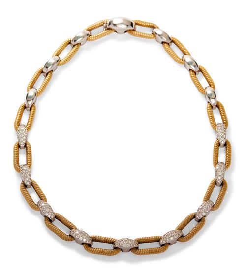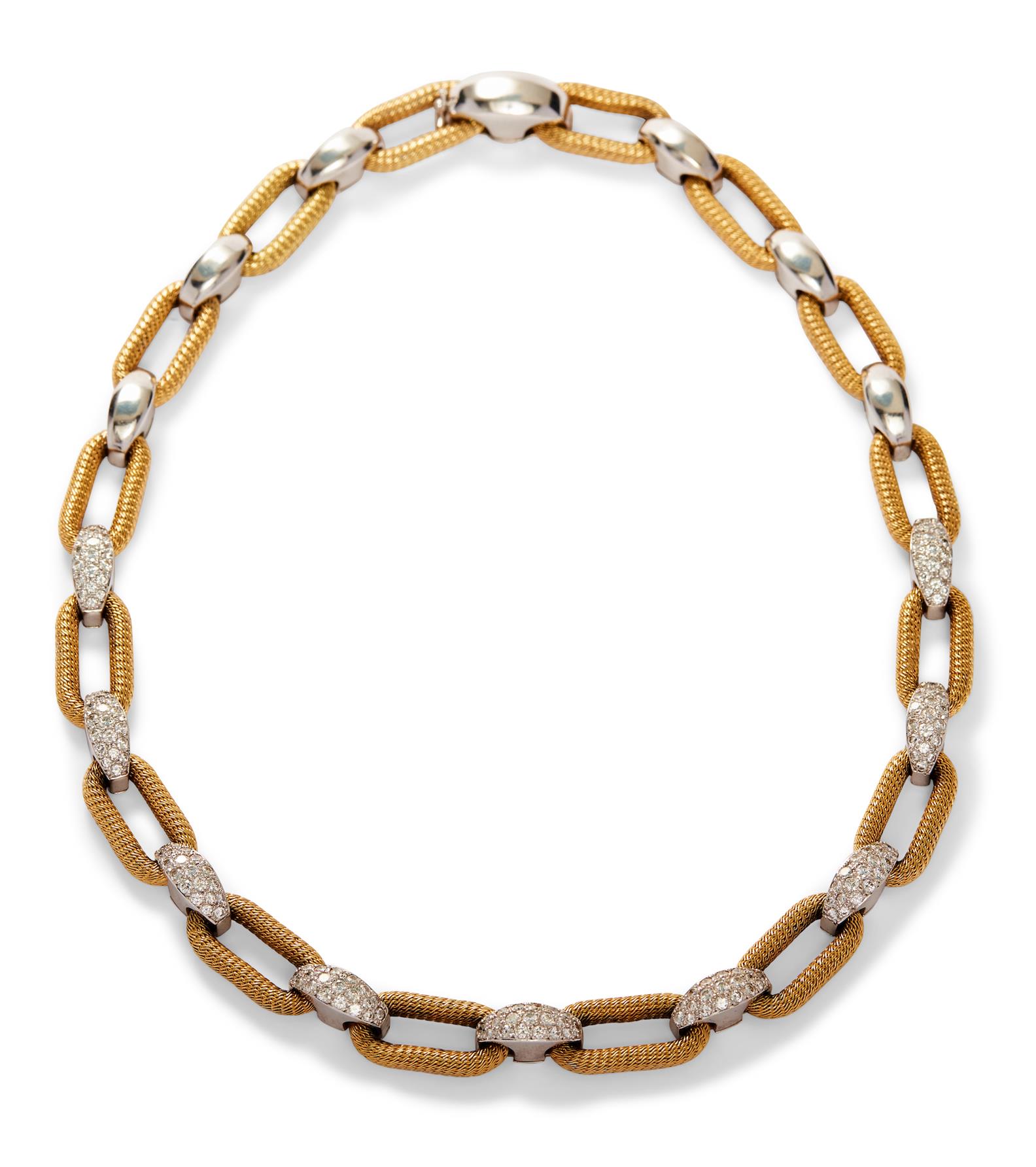 Composed of a line of openwork textured yellow gold geometric links alternating between bombé elliptical white gold connectors, some pavé-set with brilliant-cut diamonds, length 420mm, maker's mark H, stamped Italy.